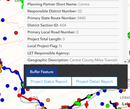 These types of reports are not available through the Reports Button in the PennDOT One Map2 Toolbar and must be accessed directly from the map after it is generated using the Area Of Interest Tool. The following sections describe how to access these reports.
