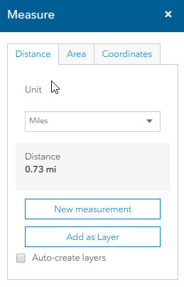 Auto-create layers - Click this checkbox to automatically add measurements you create to a drawing layer. The drawing layer displays the measurement on the map, and the description on the Legend displays the numeric measurement in selected units.